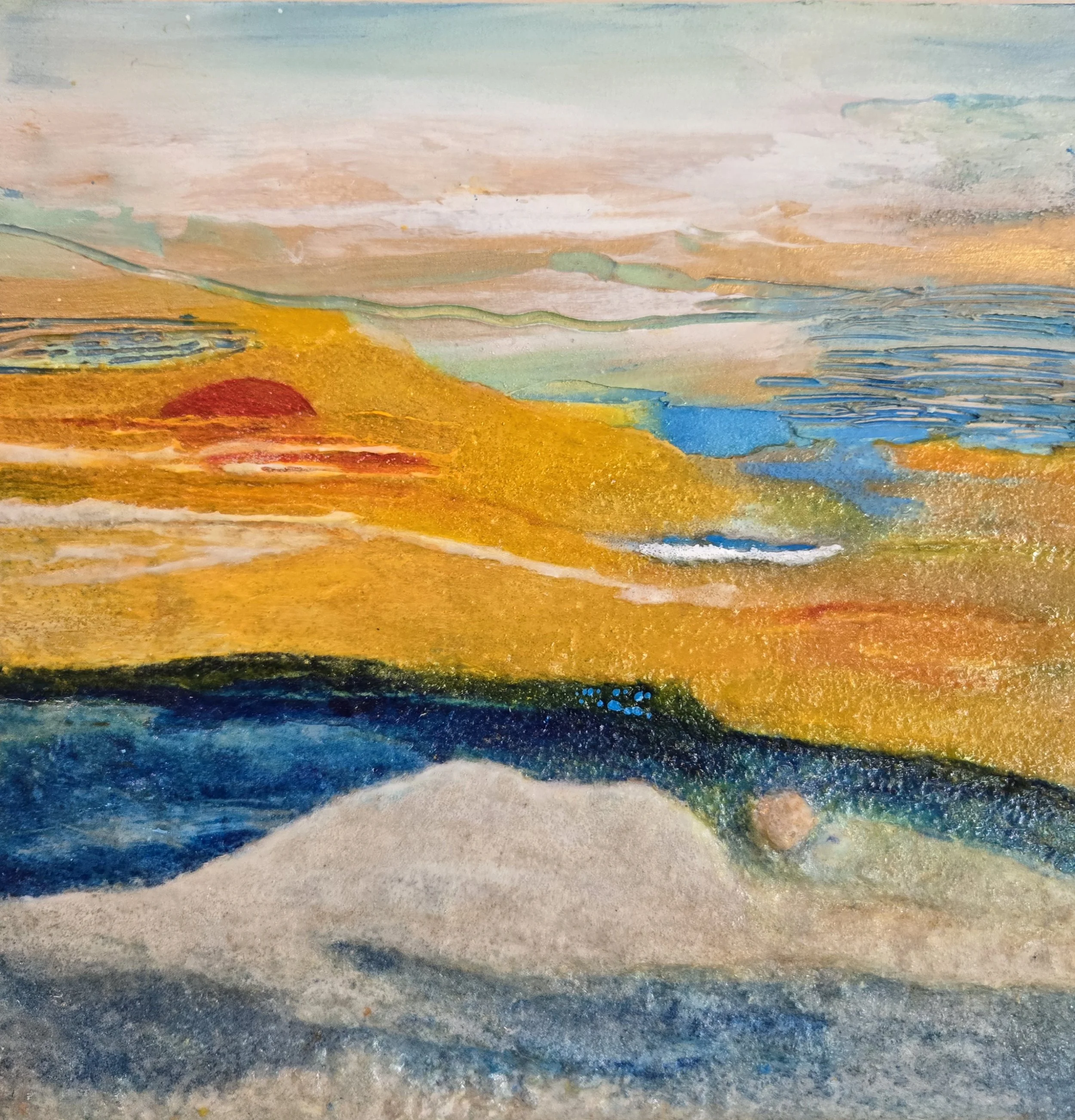 As many artists do, they change course, “I started out working in watercolour, but now I work exclusively in acrylic. Having experience with watercolour, I love the look and feel of the paint mingling on the canvas, creating the wonderful fusion of two colours.” Recently, she has been exploring something new. Betty is moving away from her usual spontaneous style to a multiple-layered style. “I am still attempting to keep the freshness and energy I love so much.”